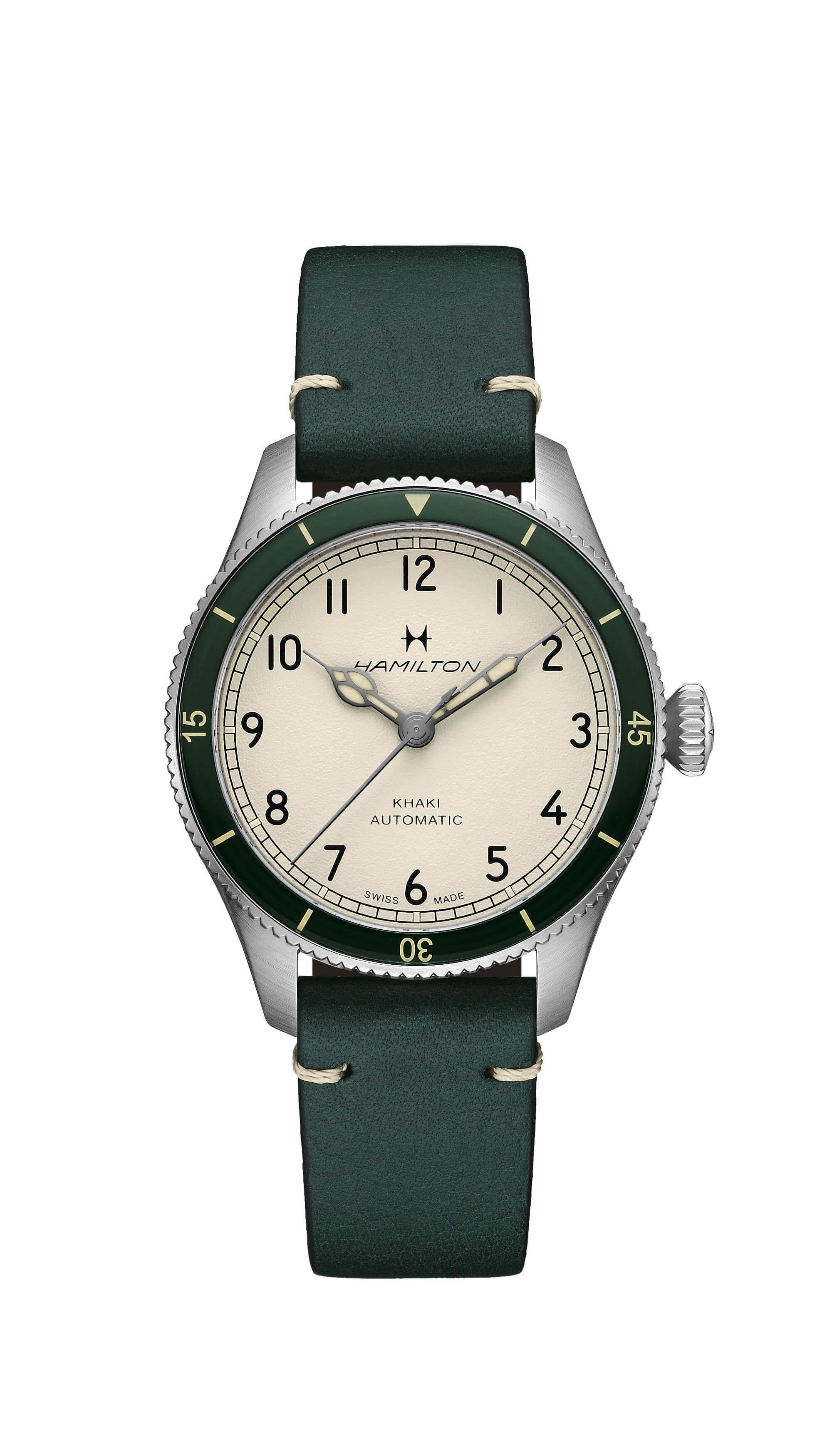 Kendine özgü retro cazibesi ile Khaki Pilot Pioneer Auto 38mm, Hamilton'ın zengin havacılık ve askeri mirasını onurlandırmaya devam ediyor. Renkli döner çerçevesi ile parlak yosun yeşili rengindeki bu model, H-10 mekanizma ve 80 saatlik güç rezervi ile donatılmıştır. Yumurta kabuğu beyazı kadranı ve yeşil deri kayışıyla bu saatin modası asla geçmeyecek.